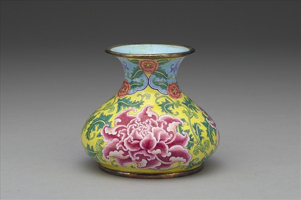 銅胎。侈口,削肩,夸腹,大圈足。器內施淺藍釉,外表黃地,頸飾雲頭紋與圖案花葉,腹繪紅、藍、紫三色牡丹。底有白地藍書「乾隆年製」雙方框楷款。此器係仿康熙朝之作品。本件一式成對(與故琺306),共儲於有「乾隆年製銅胎洋琺瑯石榴式瓶一對」題款木盒中。
