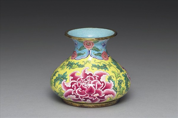 銅胎畫琺瑯。侈口,削肩,夸腹,大圈足。器內施淺藍釉,外表黃地,頸飾雲頭紋與圖案花葉,腹繪紅、藍、紫三色牡丹。底有白地藍書「乾隆年製」雙方框楷款。此器係仿康熙朝之作品。本件一式成對(與故琺308),共儲於有題款木盒中。