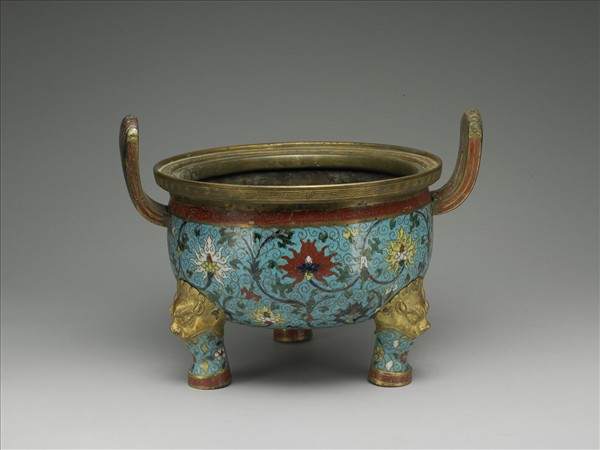 銅胎。圓口束頸,深腹圓底,朝冠耳,三柱足,足與腹交連處飾鍍金獸首。口緣鏨回紋一圈,全器以掐絲技法、琺瑯料填色為飾,淺藍色地,足下與頸腹交界處均有紅色回紋一圈,腹壁以藍地纏枝番蓮花葉紋為飾。