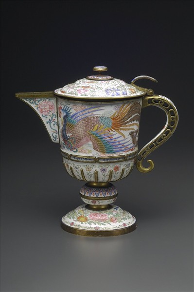 銅胎,錢幣式蓋鈕的二階式蓋,以轉軸與杯口相連,壓下按鈕即可開啟,把手由雙連環組合而成,以扁圓盒及外撇喇巴式圈足組成二階高足杯座。杯內施淺藍釉,器表白地,蓋鈕飾藍色團壽,鈕下裝飾葉紋與如意雲頭紋,周圍飾萱草、芍藥、茶花等花卉與裝飾花各一圈。杯身繪對鳳,下方飾朵花,杯座內中空施淺藍釉,器形與裝飾方式均具西洋的工藝美術風格。此器應係十八世紀後期在廣州生產的文物。