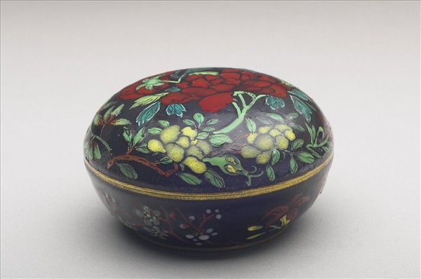 圓形銅胎小盒,器蓋與器身以子母口扣合。全器內外滿施黑色琺瑯釉料,口沿與矮圈足底鍍金。盒蓋上以紅黃、藍三色繪牡丹、月季與野菊。蓋內繪荷花數莖,盒身外壁繪梅花、萱花、叢竹,盒內繪紅色茶花一枝。盒底平面黑地金書「康熙御製」四字雙行雙方框楷書款。黑地彩繪紋樣之銅胎畫琺瑯為康熙朝之創製。此盒之底釉色澤勻實黝黑如漆,各式植物敷色厚重,花瓣與莖葉略浮出於器表,在未加暈染的平塗色彩中,隱現立體層次。