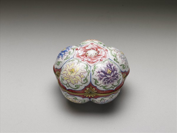 銅胎,蓋與器身同形對合成五楞式扁盒,器內施淺藍釉,器表白地,每楞內繪不同色之番蓮一朵,蓋中心凸起,四周包圍一朵牡丹花。器身紋飾與蓋相同,器底中間由雲紋圍成梅花形框,框中心飾圖案式的五瓣花,花的周圍書藍色「康熙年御製」楷書款。此類小盒通常作為印泥盒。