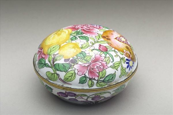 扁圓形盒,蓋與身設計成子母口接合形式,接口與足圈露胎鍍金。盒內無紋,施淺藍色琺瑯料,器外塗白,彩畫桃實、香櫞和石榴,果實之間並且點綴牡丹、月季和雛菊。花果交錯,相映成趣。外底施白料,寫有「康熙御製」四字藍料宋體款,外加雙框。