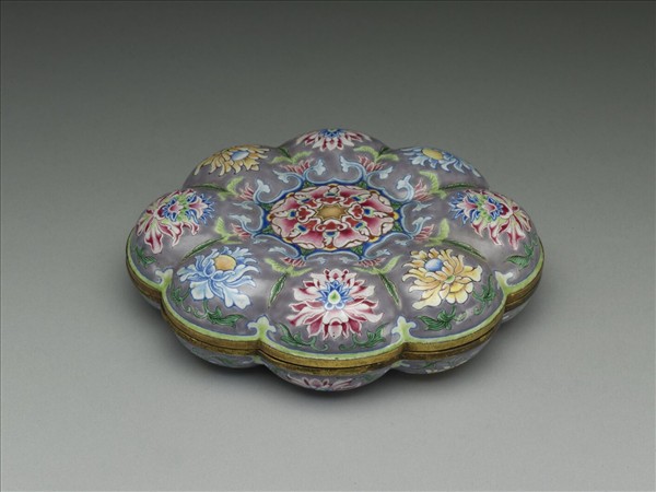 銅胎,蓋與器身同形對合成橢圓形八楞式扁盒,器內施淺藍釉,外表紫藕色地,每楞內繪番蓮一朵,蓋中心繪盛開之花一朵。盒身八楞內的紋飾與蓋相同,惟外底中心書藍色「乾隆年製」雙方框楷款。