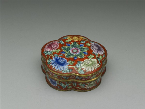 銅胎,蓋與器身同形對合成五瓣花形扁盒,器內施淺藍釉,器外壁則以磚紅色為地,器蓋上每瓣皆繪洋菊一朵,皆繞襯蓋中央盛開之正面花朵。盒身紋飾與蓋相呼應,亦以五朵纏枝菊花為飾。底為白地,有藍色「乾隆年製」雙方框楷款。