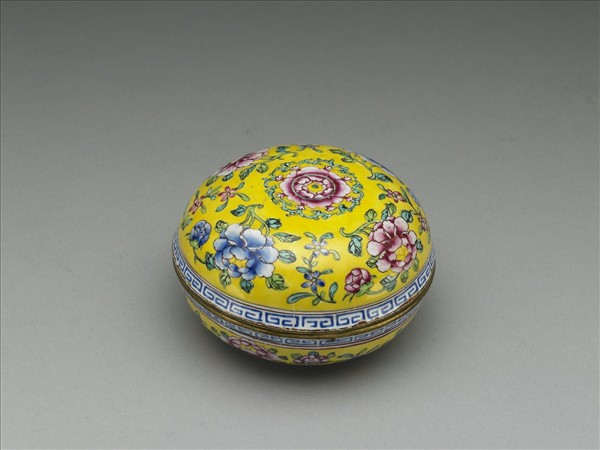 銅胎,蓋與器身同形對合成圓盒,器內施綠釉,器外壁則以黃地繪紅藍月季花葉為飾,器蓋中央並繪盛開之月季一朵。盒身紋飾與蓋相呼應,亦以黃地折枝月季花為飾,蓋沿飾白地藍色回紋。底為白地,書有藍色「乾隆年製」雙方框楷款。