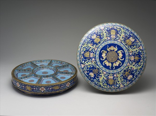 銅胎,直口,直壁,矮圈足,有蓋,中掛一盤托,盤上周圍放置八個梯形小盤,與中央一個圓形小盤拼成一大圓盤,托盤下方還有空間可盛物。器內施淺藍釉,每個小拼盤的側壁繪裝飾花葉,盤底四周由蝙蝠圍成,中央書團壽。盒外寶藍地,蓋面外圍繪花葉紋,次圈畫轉枝番蓮和佛教八寶,內圈為花葉紋,中央飾五蝠捧壽。蓋壁和盒壁畫圖案花及暗八仙,圈足飾卷草紋。