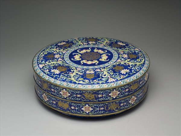 銅胎,扁圓直壁蓋盒,口掛一盤托,盤上周圍放置八個近梯形小盤,與中央一個圓形小盤拼湊成一大圓盤,托盤下方還有空間可盛物。器內施淺藍釉,每個小拼盤的壁繪裝飾花葉,盤心四周由紅蝠圍成,中央書團壽。盒外寶藍地,蓋面外圍繪花葉紋,次圈畫轉枝番蓮和佛教八寶,內圈為花葉紋,中央飾五蝠捧壽。蓋壁和盒壁畫圖案花及暗八仙,圈足飾卷草紋。