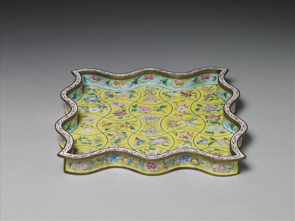 方盤造形特殊,口及器身設計成波浪形,底周鑲鍍金銅邊。口沿塗白,彩繪紅色卷草紋,內外側壁分飾藍地和黃地纏枝番蓮,盤面以黃色琺瑯料為地,縱橫交錯的藍線將底面分成二十五個銀錠式方格,內繪各類花卉。底面另以褐線畫出格紋,透過線條彎轉的變化,巧妙地勾勒出上、下、左、右四種不同視角的瓶子,以及裝飾其中的圖案,中心書「康熙御製」款。無論花卉集錦或具「錯視」效果的瓶子,無不反映出十八世紀西洋傳教士引進之西洋風尚。