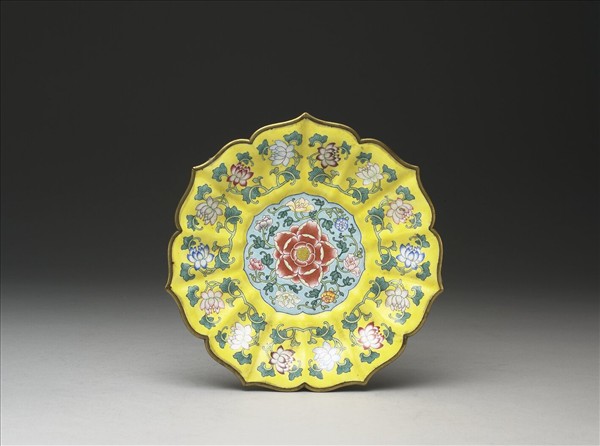 葵瓣黃地,繪深淺不一的四色纏枝蓮七對,同一組番蓮分別描繪於兩瓣鏨刻出之鎏金葵瓣,錯落有致,均勻對稱中具有律動的效果;背面亦為黃地,每瓣葵瓣繪兩兩相對之各色雙鉤卷草紋。盤心為淺藍色,中央繪紅色盛開牡丹,周圍環繞各色折枝花。白地盤底有「康熙御製」雙圓框雙行藍料款。