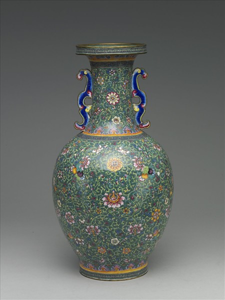 銅胎畫琺瑯,圓口,折沿,長頸,附雙耳,斜肩、弧腹,矮圈足。器內施淺藍釉,器表綠地琺瑯釉上繪纏枝花卉紋及佛手、石榴、葫蘆紋,口沿及圈足繪環帶紋,頸肩交會處及腹部下緣繪有如意雲紋。