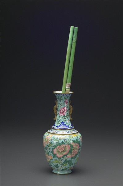 銅胎畫琺瑯,侈口,長頸,雙耳,階式斜肩、弧腹,圈足。器內施白釉,器表粉青琺瑯釉上繪折枝花卉紋,口沿及肩部繪如意雲紋,肩部繪獸面紋。附綠色染骨箸二支。