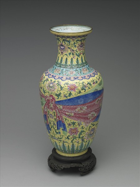 銅胎,敞口短直頸,豐肩下斂,撇足。全器以畫琺瑯技法裝飾,器內施淺藍釉,器身除局部以淺藍釉為地外,全器滿施黃釉為地,頸部由口緣而下依次飾如意雲頭、番蓮、蕉葉紋。器腹繪紅面藍邊的包袱半掩,紅色部份繪內含菊花的龜甲錦間裝飾對蝶、桃實等;包袱背面淺綠色地繪團花,包袱以外之隙地,則繪黃地番蓮紋為飾。附木座。