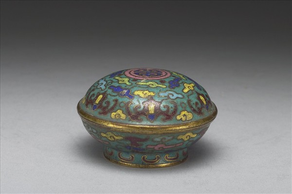 銅胎掐絲琺瑯,子母口,深壁,短圈足,帶圓弧形子母口蓋。器表以藍色為地,全器以朵雲紋為主,蓋頂中央為一「壽」字,蓋緣飾有一圈蝙蝠,寓意「福壽」雙全,圈足飾有一圈勾雲紋。底部露胎,陰刻「大清乾隆年製」楷書款及一「食」字。