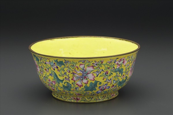 銅胎,侈口碩腹,外撇圈足,整器施黃釉為地,器壁滿飾纏枝番蓮紋,繁複而絢麗。碗內中心有變形團龍紋,盤屈作團雲狀。足內則繪飾盛開之粉紅團花一朵。此碗一式四件(故琺410-413),同成一組。