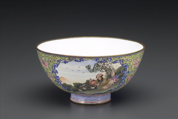 銅胎畫琺瑯黃地彩花開光人物圖碗