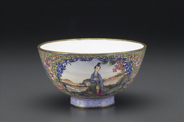 銅胎琺瑯碗,圓口斂腹,圈足略向外撇,碗內施白釉,器壁以黃釉為地,繪飾纏枝花卉紋,繁複而絢麗,飾以二藍色變形鳳紋開光,整器計有三開光,內皆繪人物樹石為飾。碗壁近圈足處有藍色如意雲頭紋一圈,圈足上飾藍色回紋一圈,足內則有紅色「大清乾隆年製」篆款,式如陽文鈐加之貌。