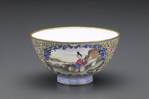 銅胎畫琺瑯黃地彩花開光人物圖碗