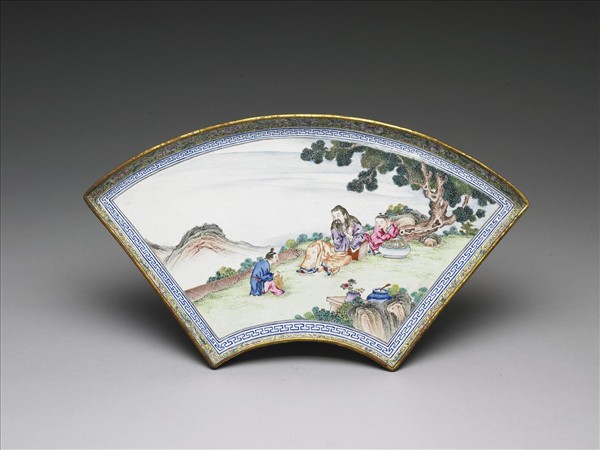 銅胎,斜壁、扇形式平底盤。內外盤壁繪飾黃地纏枝番蓮花葉紋。盤心繪人物樹石為飾,就中有童子兩人與高士一人,高士舉杯倚坐書上,而童子一坐撫酒瓶,一於高士身後,似已睡去,一派悠閒景象。底白地書紅色「大清乾隆年製」篆款。