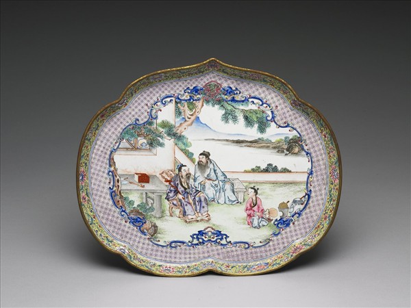銅胎,斜壁、桃形平底盤。內外盤壁繪飾黃地纏枝番蓮花葉紋。盤心由三對夔龍圍成開光,開光內人物園景為飾,就中有高士二人童子一人,高士並坐相談,童子蹲地煎茶。底白地書紅色「大清乾隆年製」篆款。