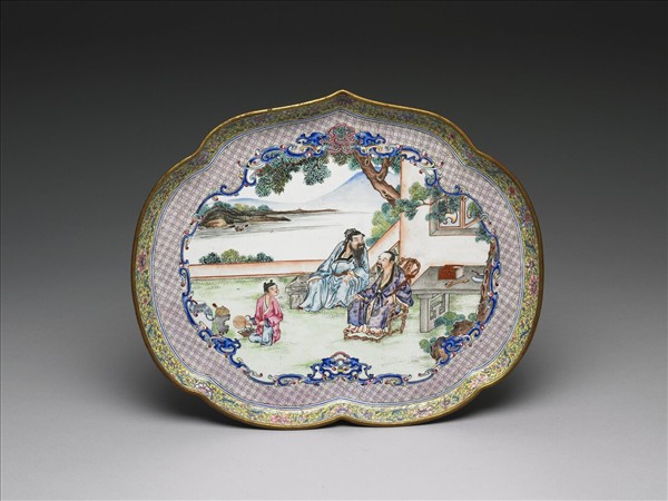 銅胎,斜壁、桃形平底盤。內外盤壁繪飾黃地纏枝番蓮花葉紋。盤心由三對夔龍圍成開光,開光內人物園景為飾,就中有高士二人童子一人,高士並坐相談,童子蹲地煎茶。底白地書紅色「大清乾隆年製」篆款。