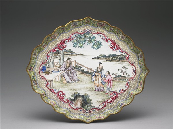 銅胎,斜壁、四瓣菱花式平底盤。內外盤壁繪飾黃地纏枝番蓮花葉紋。盤心由紅色類夔龍紋圍成菱形開光,開光內人物園景為飾,就中有高士二人童子一人,高士攜童而來,似正欲拜訪坐於椅上之高士,高士旁之桌上置有古器物,大抵將有博古賞鑑之會。底白地書紅色「大清乾隆年製」篆款。