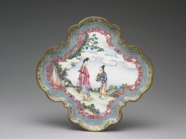 銅胎,斜壁、十字形花式平底盤。內外盤壁黃地畫纏枝花葉,盤心周圍畫人字鎧甲錦,並由四對夔龍圍成開光,內繪仕女採芝圖。底白地書紅色「大清乾隆年製」長方框三行篆書款。根據〈造辦處各作成做活計清檔〉3457號載,凡來自廣州落此種格式年款的文物,應係乾隆二十一年(1756)以後的文物。