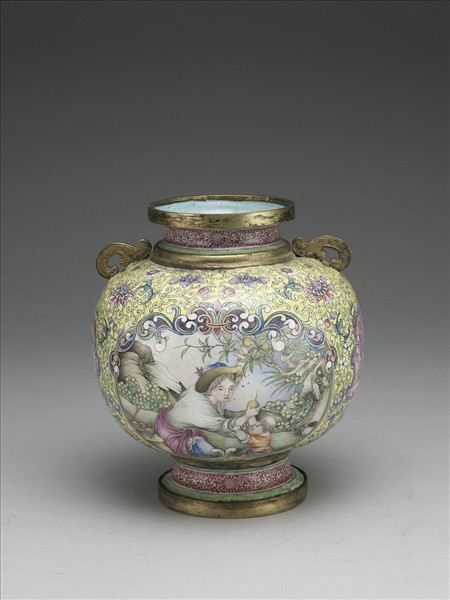 銅胎畫琺瑯。平口,收腰式頸,肩有雙螭立耳,碩腹,圈足。器身施黃釉為地,有兩兩相對之開光,分繪西洋母子人物與紫紅色的西式風景畫,餘地滿飾纏枝番蓮紋,頸足各圍紫色纏枝花一周。器底白地藍書「乾隆年製」楷款,加雙方框。收在有題款木匣中。