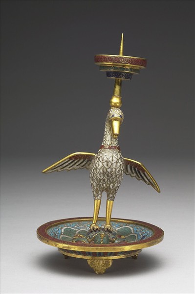 銅胎,掐絲琺瑯。燭台,由倒三階式承盤、海燕與盤座組成。盤內壁掐絲作江水波濤,上飾龜蛇合體的玄武,龜背上立展翅海燕,燕身白有紅頸圈與黑尾,掐絲羽紋濃密細緻,燕頂作靛藍、綠、紅三色飾連續曲線紋燭臺。盤底中心露胎,陰刻楷款「乾隆年製」,本器一式成對(與故琺445),共收於有題款「乾隆年製銅胎掐絲琺瑯海宴河清書燈一對」的木匣中。「海宴河清」典出《幼學瓊林》「海不揚波,知中國有聖人」,表示天下太平之意。
