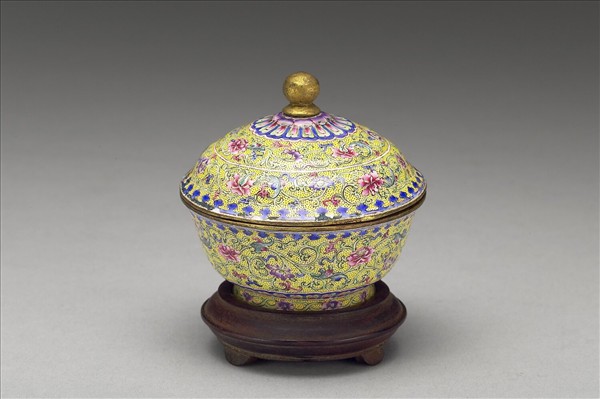 銅胎畫琺瑯。蓋碗式小盒,侈口,弧形壁,圈足,帶球鈕圓頂蓋。全器施黃釉為地,繪滿纏枝番蓮花,鈕與圈足上與口緣另飾蓮瓣紋或如意雲紋一周。器內施湖藍釉,底白地藍書「乾隆年製」,有木座,香盒用以盛裝焚香料,與香爐、香瓶三件一套,共收於有題款為「乾隆年製銅胎廣琺瑯鑪瓶盒一份」的木匣中。