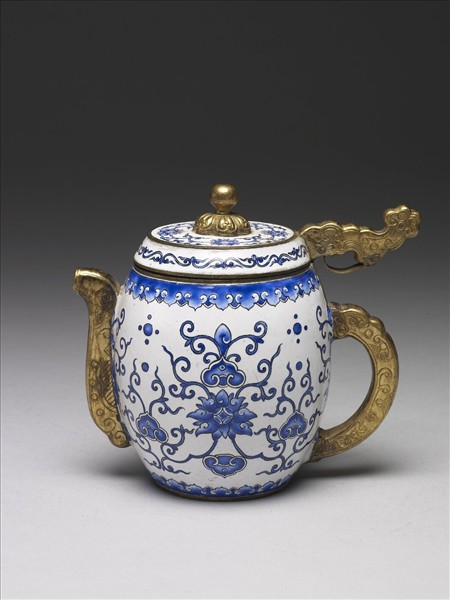 銅胎畫琺瑯。平口,碩腹,流與把露胎,球鈕平頂蓋,帶轉軸式板形螭鍍金壓把,搭配同風格的鍍金流。全器施白釉為地,繪鈷藍色連枝番蓮紋與雲紋,為仿青花瓷效果。器底藍書「乾隆年製」圍雙方框,本器一式二件(與故琺451),共收於題款為「銅胎廣琺琅銚」的木匣中。