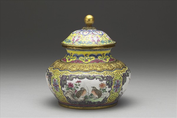 銅胎畫琺瑯。微侈口,收腰式頸,碩腹下斂,圈足,帶球形鈕圓冠式蓋。器表黃地,繪如意雲頭紋和纏枝花葉,器腹以卷草紋為錦,四開光內繪各種傳統花鳥寫生圖景,肩部露胎鏨蓮瓣紋一周。器內施淺藍釉,底白地藍書「乾隆年製」楷款,加雙方框。本件一式成對(與故琺453),共藏於題款為「乾隆年製銅胎畫琺瑯石榴花鳥蓋罐一對」的木匣之中。