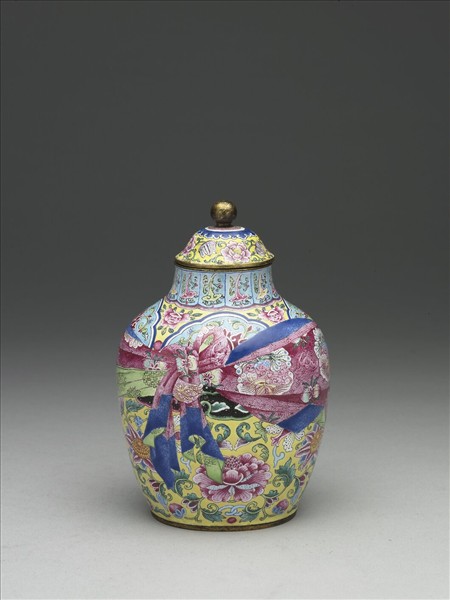 銅胎畫琺瑯。扁圓形罐,直口,豐肩,碩腹下斂,圈足,帶球鈕圓蓋。器身以黃釉為底,繪纏枝番蓮紋、雲頭紋及各式花朵,肩部疊繪上紅面藍邊包巾,作半掩包裹狀,線條輕軟自然,具日本工藝美術的裝飾風格。器底綠地小花邊飾,書「乾隆年製」白地紅色款加雙聯圈。本件一式二件(與故琺456),共收於有題款木匣中,題款為「乾隆年製銅胎廣琺瑯包袱式罐一對」,係仿自雍正朝作品。