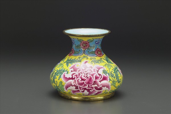 銅胎。侈口,斜肩,垂腹,矮圈足。器內施淺藍釉,器表黃地,口沿繪有藍地開光及花卉紋邊飾,腹部繪有紅、藍、紫色牡丹各一,隙地飾有花葉紋。圈足內白地書藍色「乾隆年製」雙方框雙行楷體字款。與故琺000461為一對。