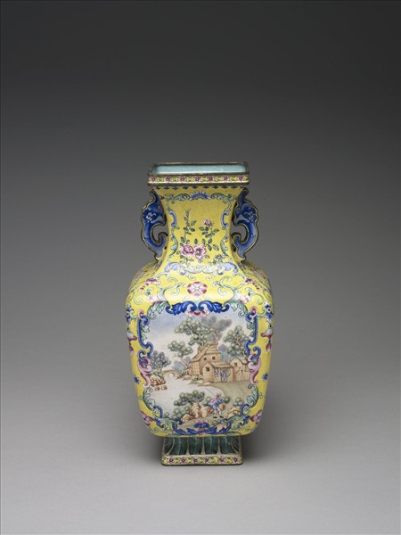 銅胎。方形盤口,斜肩,方腹,雙螭形耳,高圈足。器內施淺藍色釉,器表以黃色為地,口緣及圈足下緣各飾一圈花卉紋,器身為花卉紋錦地,腹部四面開光,正反面繪風景、人物,兩側繪山水及「三羊開泰」,圈足飾有一圈蕉葉紋。底白地藍書「大清乾隆年製」三行篆書款。附如意雲足方形紫檀木座一只。與故琺000475為一對。