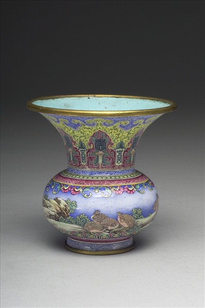 銅胎,侈口,長頸,圓腹,圈足外撇。器內施淺藍色釉,口沿下方繪藍色如意雲紋,頸部為夔龍紋圍成之變形蕉葉紋,內有「壽」、「福」字,下接卷草紋、花卉紋。除此之外,頸外壁之隙地則繪飾草綠底綠卷草。腹部繪鵪鶉樹石山景,上方飾以花葉紋,下方繪一圈變形蓮瓣邊飾,上下各有一圈紅色轉枝菊花紋邊飾,圈足繪有朵雲紋。底白地藍書「乾隆年製」雙方框雙行宋體款。