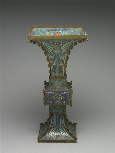 銅胎。器仿青銅觚造型,通體作方形,喇叭口,鼓腹,高足外撇,四角出戟。全器以掐絲琺瑯為飾,施藍與綠色釉為地,以腹部獸面紋為中心,對稱裝飾番蓮紋、回紋與蕉葉紋等,口內亦飾有番蓮紋與回紋。本器與故琺483一式成對。