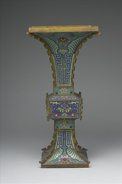 銅胎。器仿青銅觚造型,通體作方形,喇叭口,鼓腹,高足外撇,四角出戟。全器以掐絲琺瑯為飾,施藍與綠色釉為地,以腹部獸面紋為中心,對稱裝飾番蓮紋、回紋與蕉葉紋等,口內亦飾有番蓮紋與回紋。本器與故琺482一式成對。