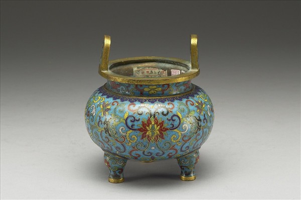 銅胎,銅胎略有銅銹,器內鎏金磨損。三足爐,侈口,收頸,深弧腹,雙朝冠耳,圓底,下接三柱足。以掐絲琺瑯為飾,器腹與雙耳施淺藍釉為底,上滿飾纏枝番蓮紋,器頸加飾連枝花卉與如意雲紋各一圈。器底方形露胎處陰刻楷款「乾隆年製」、「池」。