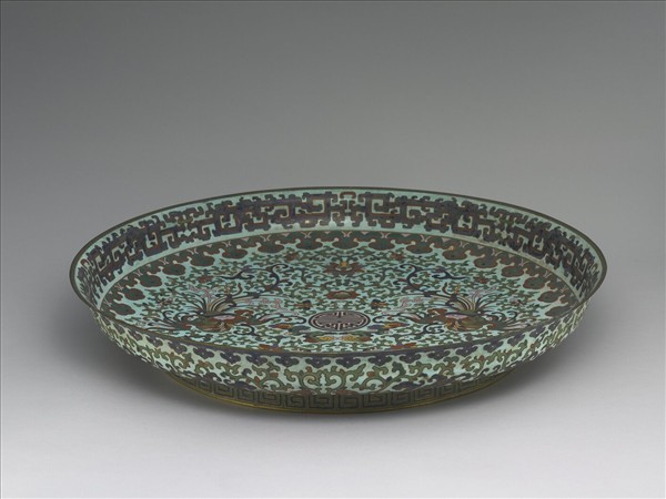 掐絲琺瑯,銅胎。直壁撇口,圈足。盤內外施淺藍色釉地,盤周以雲紋一圈為界,內滿飾纏枝番蓮花,中心以五色祥雲拱出團「壽」字,左右並飾鳳凰一對,器外壁飾卷草變形龍紋。器底圈足露胎,無款。