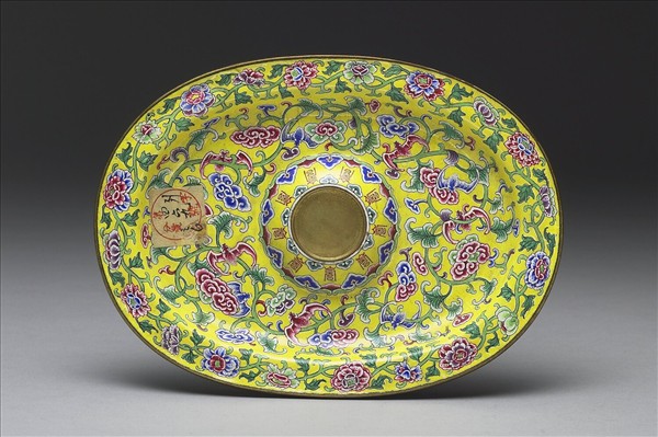 銅胎。橢圓形淺盤,寬折沿,盤心凸起中有圓形淺槽。以黃釉為地,繪桃紅、藍、綠色纏枝花卉,枝葉間有靈芝雲、蝙蝠飛繞,吉祥寓意與盤心飾祥雲「壽」字相呼應。器底施藍色釉,底心墨書「雍正年製」宋體字款,上承畫琺瑯小杯成組(故琺492)。