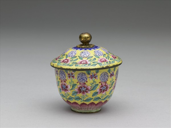 銅胎。帶蓋小杯,侈口,深弧壁,圈足,穹頂式蓋,蓋上有圓球鈕。全器外施黃釉為地,器與蓋各繪桃紅色折枝花與纏枝花一圈,花朵上方延伸出團壽字裝飾,蓋鈕下方周飾雲紋;器底周飾幾何蓮瓣紋。器內施藍色釉,底有藍色雙方框墨書「乾隆年製」楷款,下接托盤成組(故琺497)。