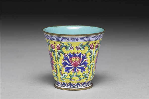 銅胎。侈口外撇,筒腹。器壁以黃釉為地,繪飾紅與藍色折枝番蓮花葉四朵,上下加飾回紋及如意雲紋一道,器內施淺藍色釉。底為白地墨書「雍正年製」宋體字款,下接托盤成組(故琺508)。
