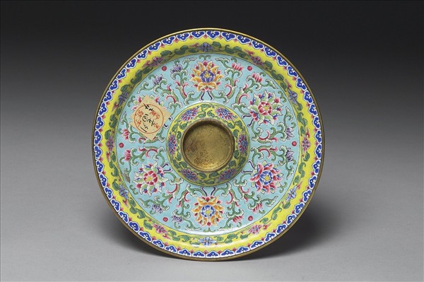 銅胎圓形淺盤,盤面淺藍釉為地,繪深淺多彩折枝番蓮花,口緣飾如意雲紋。器底施藍色釉,底心墨書「雍正年製」宋體字款。與故琺507小杯成組。