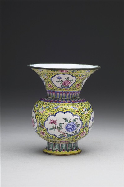 銅胎。侈口,圓腹,高圈足。器內施白釉,器表黃地,口緣及腹部下繪一圈花葉紋邊飾,頸部與腹部四面各有一開光,內為白地繪折枝花卉,窗外隙地繪纏枝花紋,頸肩處飾有一圈變形蓮瓣紋邊飾,圈足飾有一圈蕉葉紋,圈足內白地書紅色「乾隆年製」雙方框雙行楷體字款。與故琺000513為一對。