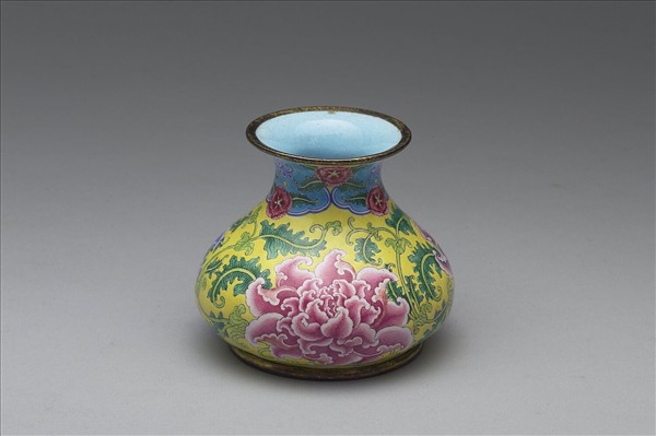 銅胎。敞口,溜肩,垂腹,矮圈足。器內施淺藍釉,器表黃地,口沿開光繪有藍地開光花卉紋邊飾,腹部繪有紅、藍、紫色牡丹各一,隙地飾有花葉紋。圈足內白地書藍色「乾隆年製」雙方框雙行楷體字款。