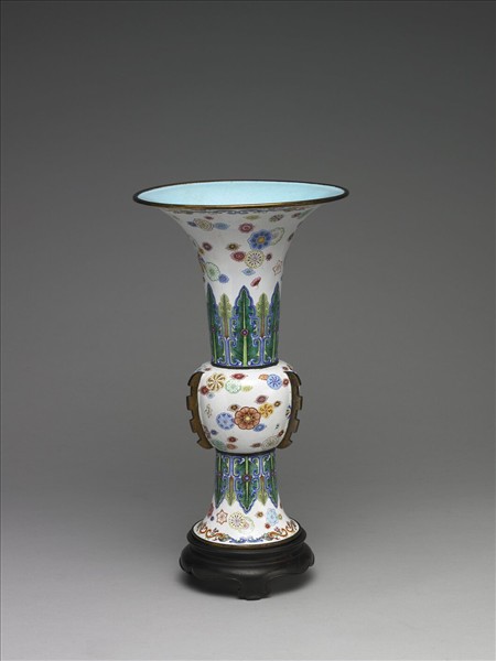 銅胎,仿青銅酒器觚的形制,明清時期常將其當花瓶使用。喇叭口,鼓腹處飾四棱脊,器內施淺藍釉,器表白地多彩繪蕉葉及皮球花裝飾。底白地書藍色「乾隆年製」雙圓框兩行楷書款。皮球花的紋飾在康熙朝的瓷器上常見,偶而也出現在小型的畫琺瑯的小盒上,到乾隆朝,則常出現在各種器型上。