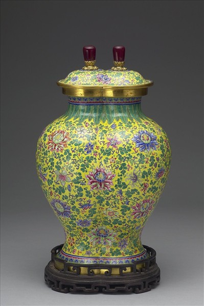 銅胎,豐肩,斂腹撇足,器形似雙魚頭尾相對並連,器蓋鑲二紅料寶珠鈕,有鎏金圈足。頸部繪蕉葉紋,器身滿繪黃地纏枝蓮等花葉紋飾,繁複縟麗。底有白地「乾隆年製」藍料款。雙連又可稱「合歡」, 象徵合和的吉祥寓意。