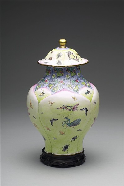 銅胎,球紐展檐斗笠式蓋,蓋沿由大小雲紋各四圍成,蓋面鏨成四片蓮瓣式凸起;罐口呈八瓣花式,八楞式頸,器腹由凸起的大小蓮瓣各四包圍成,底呈四瓣海棠式內凹。全器除頸和肩部為淺藍地繪花果紋外,餘以粉紅及黃綠色暈染蓮瓣,並於其上繪蝶、蜻蜓、蝸牛、蜂、甲蟲、蟋蟀、蚱蜢、蝗蟲等。底白地書紅色「乾隆年製」雙方框雙行楷書款。附木座。