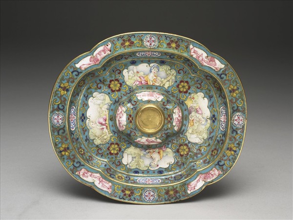 銅胎,四瓣式折沿平底盤,折沿與盤內各有四開光,中心凸起盞槽,上亦有四開光,折沿之開光與盞槽皆飾白地紅色山水,盤內底之開光則是西洋人物母子圖。除開光與外底外,整器皆掐絲藍地花卉紋為飾。底外有「乾隆年製」楷款。